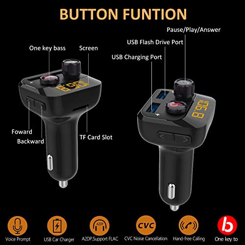 Trasmettitore FM, V 5.0 Bluetooth trasmettitore FM per auto MP3 Bluetooth Music Player kit vivavoce auto con Bass Booster, due porte USB 5V / 3.4A, Play scheda TF/USB Flash Drive