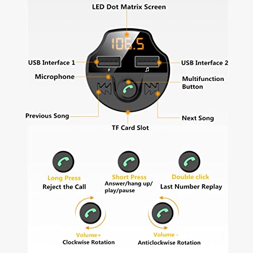 【Doppia Porta USB & Ricarica Sicura】: Ha due porte di ricarica USB, può caricare due dispositivi contemporaneamente e ha una protezione da sovraccarico. Il dispositivo è più sicuro durante la ricarica. Il trasmettitore FM con chip intelligente integrato dividerà automaticamente la tensione in base alla necessità del dispositivo.