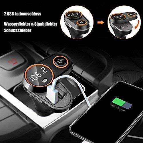 Caricabatterie Dual USB - Il trasmettitore FM con 2 porte di ricarica USB (uscita 5 V-2.4 A) possono essere utilizzati contemporaneamente e consentono la ricarica simultanea di due dispositivi. Il trasmettitore a 2 porte garantisce efficienza di ricarica e offre una velocità di ricarica più rapida e stabile, un buon trasmettitore FM per auto/kfz