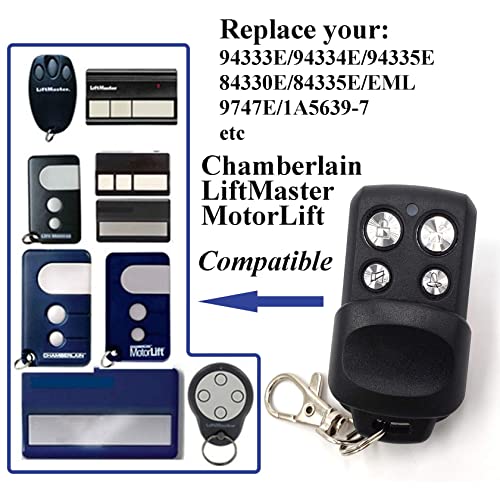 Telecomandi compatibili: tutti i telecomandi Liftmaster che iniziano con "9443", tra cui 94330E, 94333E, 94335E, 94330EWK, 1A5639-7. Tutti i telecomandi Motorlift che iniziano con "8433" e terminano con "EML", tra cui 84335EML, 84330EML, 84333EML.