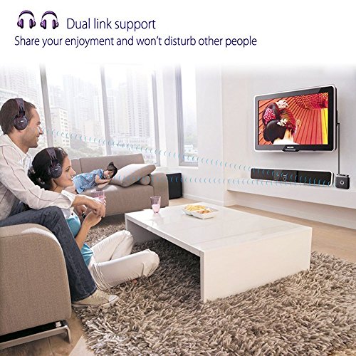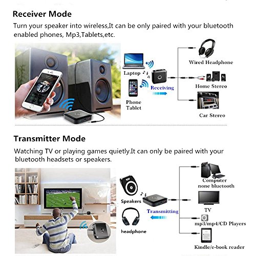 2 in 1: questo trasmettitore e ricevitore Bluetooth può inviare o ricevere 2 dispositivi base, significa che non solo musica a due auricolari Bluetooth possono trasmettere, ma anche di ascoltare musica e film con il più persone