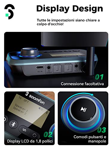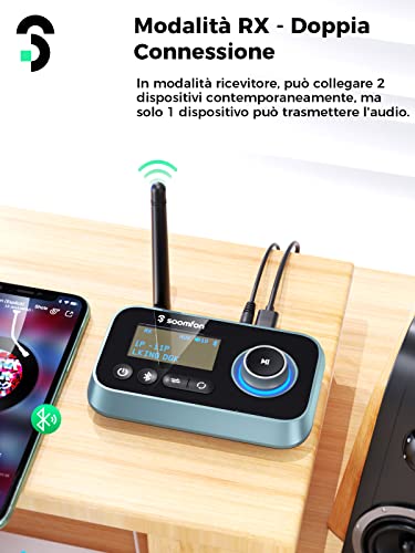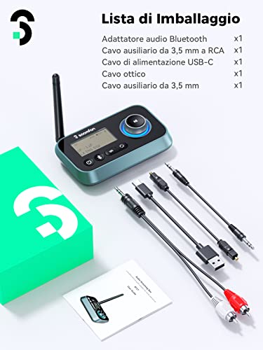 Trasmettitore Ricevitore Adattatore Audio Bluetooth 5.0 con Cavi Aux/Ottico/RCA, SOOMFON Adattatore Audio Hi Fi con Jack 3.5mm e Optical, per TV, PC, Lettore CD, Stereo Casa, Cuffie, con LCD Display