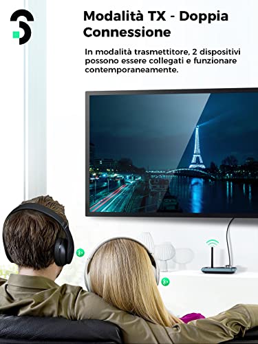 【Bluetooth 5.0 - Lunghezza e Trasmissione Stabile】 L'audio dell'adattatore Bluetooth utilizza la tecnologia 5.0, garantisce una trasmissione più stabile e più veloce, un basso consumo energetico fornendo prestazioni audio superiori. La distanza di trasmissione dei dati può arrivare fino a 14 m in modalità TX, 20 m-30 m in modalità RX. Puoi cucinare la cena senza perdere un momento mentre guardi la TV o ascolti le notizie tramite Bluetooth.