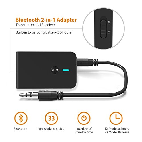 【Extra-Lunga Batteria 】Ricevitore Bluetooth per autoradio con 10 ore di Gioco / Parlare. E ci vogliono solo 1,5 ore per caricarlo completamente. L'adattatore Bluetooth 2 in 1 può riprodurre musica, film e programmi TV anche durante la ricarica.