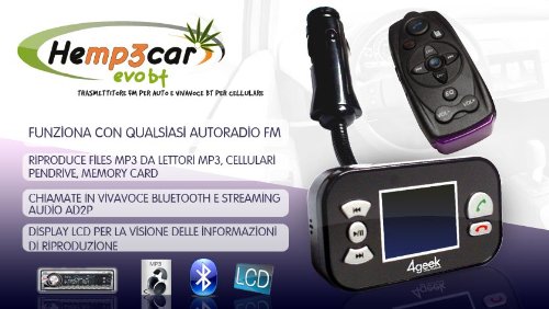 Trasmettitore FM e Ricevitore Bluetooth per Auto Hemp3Car Evo BT 4Geek - Lettore Mp3 / Wma con Display LCD Monocromatico - Vivavoce per Cellulare e AD2P - Ingresso 3.5 mm - Slot SD - USB - FMT-2C-BT