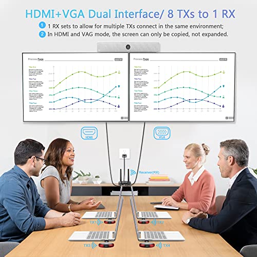 ✅【Doppio schermo di trasmissione: trasmissione radio HDMI progettata con un'interfaccia HDMI e VGA, in modo da poter trasferire due schermi contemporaneamente. Un ricevitore può essere accoppiato fino a 8 canali HDMI che commutano con un pulsante. Nota: il suono non può essere trasmesso in modalità VGA, si prega di collegare il cavo audio (incluso) per la trasmissione audio.