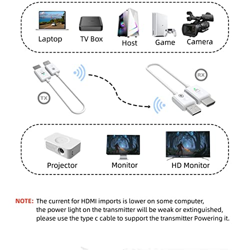 【Trasmettitore e ricevitore HDMI wireless】 Il trasmettitore e il ricevitore HDMI wireless compatti sono progettati per lo streaming wireless di video e audio su un grande display. Può trasmettere qualsiasi contenuto da laptop / fotocamera / decoder via cavo HDMI a HDTV, proiettore, monitor DHMI. Il rapido trasferimento video e la sincronizzazione del suono migliorano notevolmente l'efficienza per il tuo lavoro e la tua vita. ma non è consigliabile utilizzarlo nei giochi.