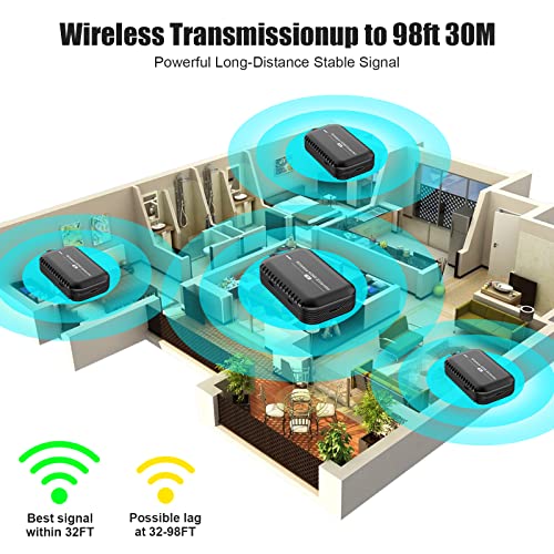PWAYTEK Trasmissione wireless a doppia frequenza. La distanza di trasmissione HDMI wireless raggiunge fino a 30 metri, utilizzando un protocollo di trasmissione 2.4G/5G per segnali più forti e stabili. (Nota: la distanza e la velocità di trasmissione possono essere influenzate quando il prodotto passa attraverso le pareti o incontra ostacoli)