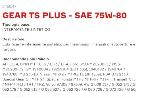 1 LT OLIO TRASMISSIONI MECCANICHE AUTO PAKELO GEAR TS PLUS SAE 75W-80 100% SINT