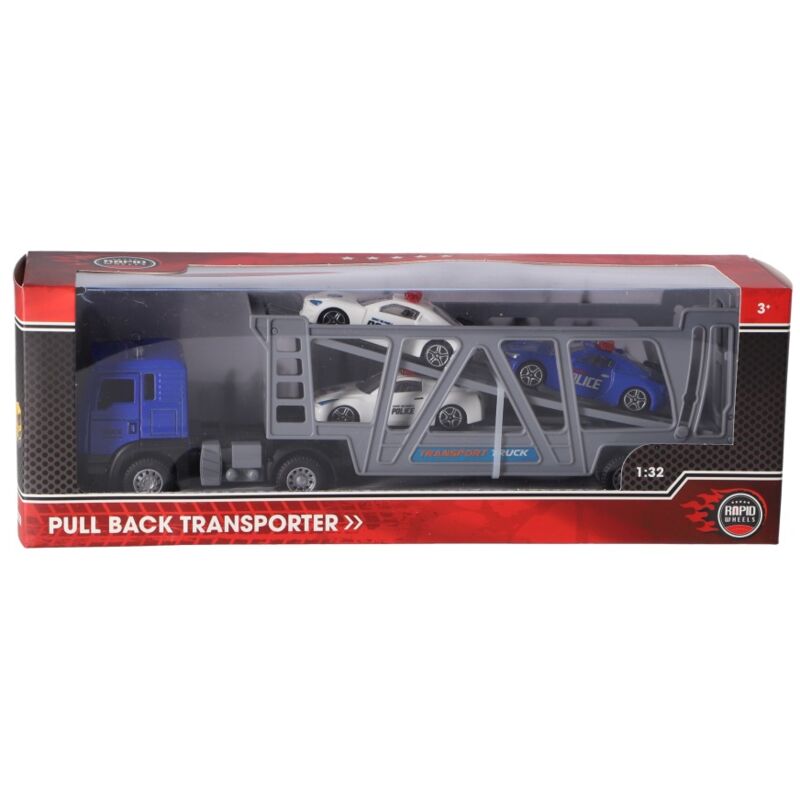 Trasportatore pull-back pressofuso Rapid Wheels con 3 veicoli sul rimorchio. Scala 1:32. Adatto a bambini dai 3 anni.