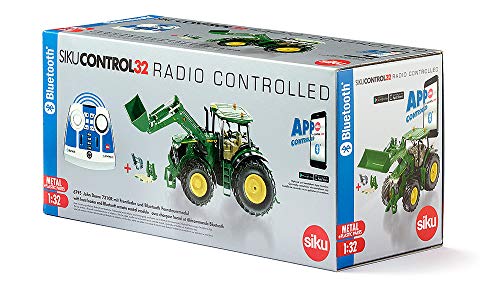 Siku 6795, Trattore John Deere 7310R con caricatore frontale, Verde, Metallo/Plastica, 1:32, Telecomando Bluetooth e accessori inclusi, Telecomandabile da app