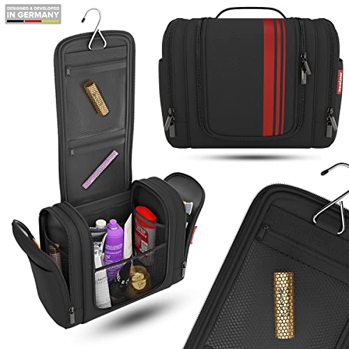 Travelaner Beauty Case da Viaggio [Design 2023] | Trousse da Bagno da Appendere per Donne, Uomini e Bambini | Beauty da Viaggio di Qualità Premium con Volume Interno di 7 Litri (Nero/Rosso)