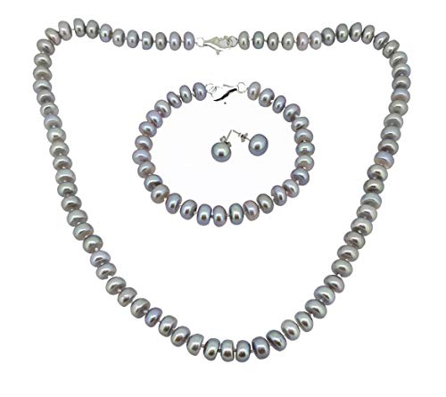 TreasureBay Parure di gioielli con perle d'acqua dolce grigie classiche, collana, bracciale e orecchini da donna, Perla, Perla
