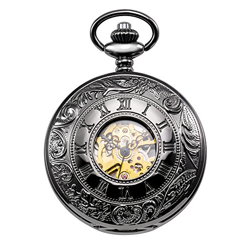 TREEWETO Orologio da tasca meccanico da uomo, con numeri romani, a metà cacciatore, nero