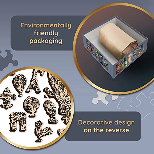 I puzzle con forme irregolari ti permetteranno di creare un'immagine con dimensioni di 375 x 519 mm. I pezzi del puzzle sono confezionati in un sacchetto di carta e un imballaggio di cartone ecologico.