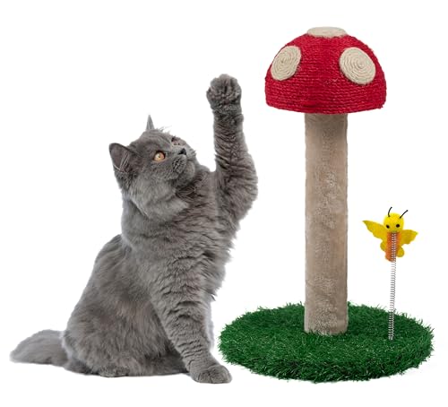 TREKAM Tiragraffi per gatti con tre diverse texture- Albero tiragraffi per gatti a forma di fungo 45cm di altezza - Tiragraffi per gatti adulti e piccoli con giocattolo a molla - graffiatoio per gatti