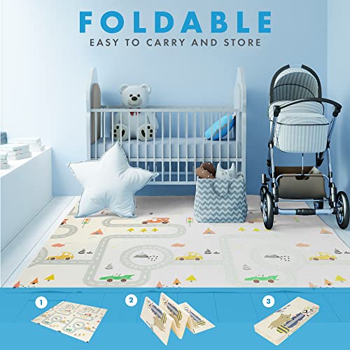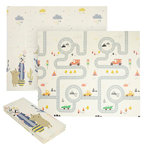 【 Pavimento in gomma EVA reversibile e pieghevole】 Disegni su entrambi i lati (giocattoli da strada e animali). Design originali pensati per intrattenere il tuo bambino. Si allunga sul pavimento e si piega in 5 passaggi in modo facile per riporre in modo compatto in poco spazio. Con borsa per il trasporto e la conservazione.