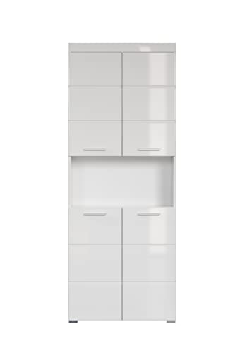 Armadio alto elegante e facile da pulire con quattro ante, uno scomparto aperto, due basi fisse e due mensole interne, con struttura di colore bianco e parte frontale bianca con finitura ad alta lucentezza