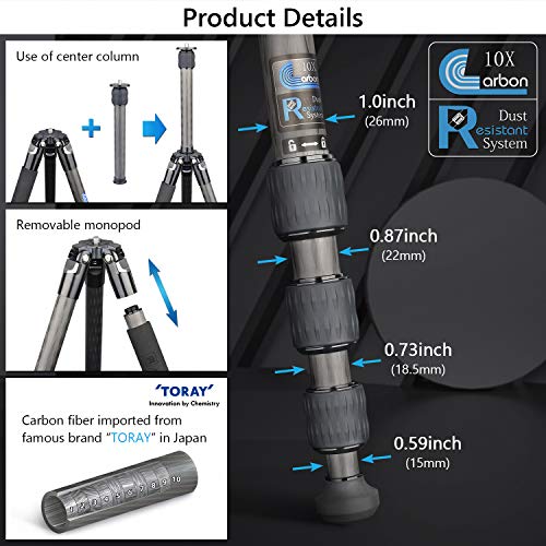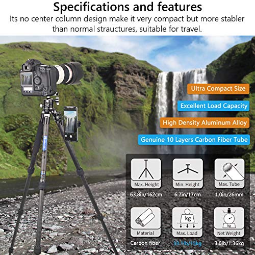 【Ultra leggero e compatto】 Questo treppiede in fibra di carbonio utilizza 10 strati di fibra di carbonio al 100% ed è molto leggero, pesa solo 3 libbre. Il nuovissimo design della colonna centrale esterna rende le tre gambe di questo treppiede completamente vicine tra loro, quindi il suo volume di archiviazione è molto piccolo, il diametro di questo treppiede è di soli 72 mm quando è piegato, è molto adatto per i viaggi!