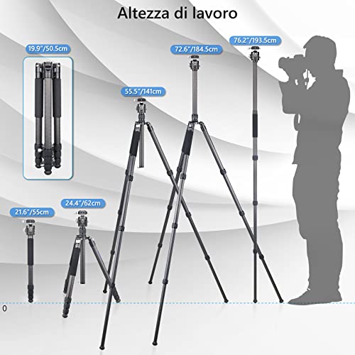 Treppiede per fotocamera in fibra di carbonio 72,6"/184,5 cm, treppiede compatto ARTCISE AS85C, colonna centrale, treppiede monopiede 2 in 1, reflex, testa a sfera CNC doppia panoramica MB44