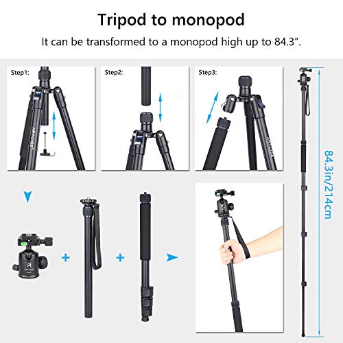 Treppiede per fotocamera 210 cm, monopiede per treppiede da viaggio ARTCISE AF30 in lega di alluminio, testa a sfera interamente in metallo da 36 mm e colonna centrale, carico massimo 15 kg