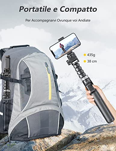【Struttura Integrata E Pieghevole】Modello innovativo con speciale superficie testurizzata antiscivolo, piegato per tenere facilmente in mano il Selfie Stick Treppiede grazie alla sua struttura più ergonomica, e le finiture sofisticate rendono il Treppiede per Selfie Stick pratico un aspetto più squisito. Il formato pieghevole è di soli 38 cm e pesa solo 435 g. Si ri