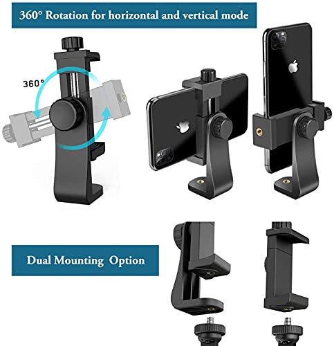 360 Grad drehender Telefonhalter für Hochformat (vertikal) oder Querformat (horizontal), ohne das Telefon aus dem Stativ nehmen zu müssen. Adapter Breite einstellbar: die Clipgröße ist 2,2 "- 4" / 54mm - 102mm. Anbringbar an jede reguläre Größe Stativ, Selfie-Stick oder ein anderes Gerät, das internationale Standard-Schrauben 1/4 Schnittstelle hat (Achtung: Bitte überprüfen Sie Ihr Telefon Größe vor dem Kauf).