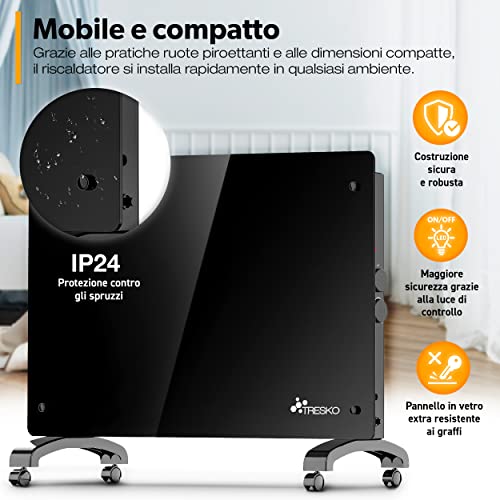 TRESKO Stufa Elettrica Basso Consumo Nero 1500W | Stufa Elettrica basso consumo | Termoconvettore con Rotelle | Termosifone Elettrico Portatile | Termoconvettore a Parete con Termostato per Casa