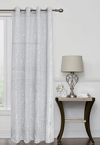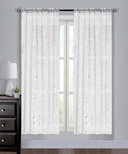 Home Tresor - Coppia Tende a Vetro | Tende per Interni Cucina, Cameretta, Soggiorno | Mod. Lory R2 Semitrasparente Base Bianca Motivo Argentato (60 x 150 cm)