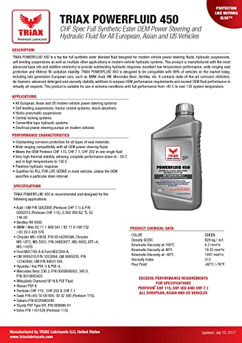 TRIAX Powerfluid 450 CHF - Fluido Completamente Sintetico (VERDE) per Servosterzi, Sospensioni Idropneumatiche, Chiusure Centralizzate, conforme alle specifiche CHF11S, CHF 202 e CHF 7.1. (1 quarto)