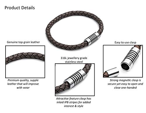 Tribal Steel Bracciale da uomo in pelle marrone acciaio inox da 21cm con robusta chiusura magnetica e dettaglio placcato a ioni nero (IPB)