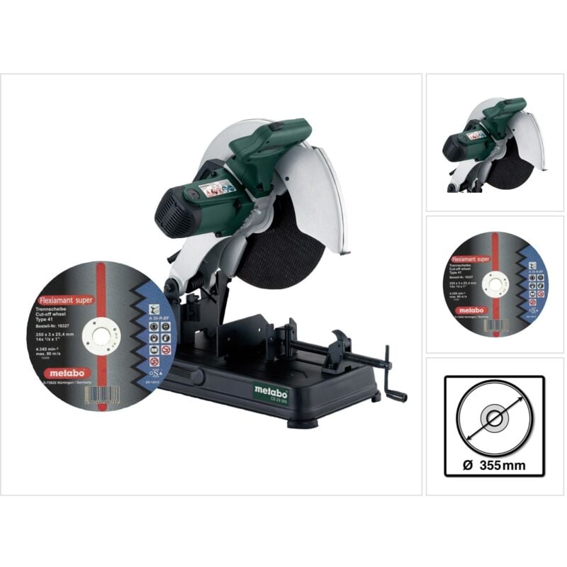 Metabo - Motosega a disco 2300W 355mm con Flexiamant Super - CS 23-355 I vantaggi di questa sega a disco Metabo CS 23-355 sono: - Per la corrente alternata monofase - Per il taglio veloce ed efficiente di profili, tubi e barre in acciaio, ghisa, alluminio e altri metalli non ferrosi - Motore e riduttore con cuscinetti a sfera e progettato per i carichi più elevati - Blocco del mandrino per una facile sostituzione della ruota - Dispositivo di serraggio rapido con inclinazione regolabile in continuo per tagli obliqui da -15° a 45 - Trasporto facile grazie alla maniglia di trasporto integrata e al blocco di trasporto - Protezione girevole del disco da taglio - Piastra guida-scintilla regolabile - Protezione contro l'accesso dal basso - Fermo di profondità regolabile Dati tecnici: Per mole (Ø x foro) 355 x 25,4 mm Coppia 18 Nm Velocità a vuoto 4.000 /min Consumo di potenza nominale 2.300 W Dimensioni massime di taglio - barre d'acciaio 65 mm - tubi 125 mm - profilo in acciaio 115 x 130
