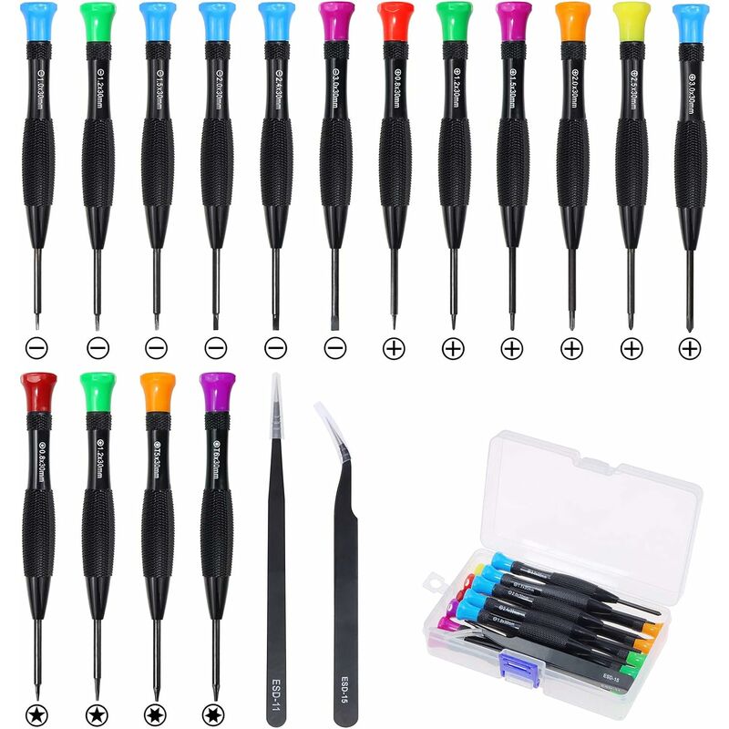 2 pinze: ESD11, ESD15. Tutti sono inseriti in una scatola trasparente per mantenerli ordinati, organizzati e facili da trovare. Ben progettato e facile da usare - Tutti questi cacciaviti hanno un giunto girevole con cuscinetto a sfera e sono ricoperti da una scala pesce di superficie per un lavoro più veloce e resistenza allo scivolamento. La punta del cacciavite è magnetica, quindi le viti piccole non cadono (non valido per le viti in acciaio inossidabile). ALTA QUALITÀ E DURATA - Realizzata in acciaio legato al cromo-vanadio, la punta metallica del cacciavite è resistente all'ossidazione, alla corrosione e alla ruggine ed è molto resistente. Il manico è realizzato in materiale PP-TPR, che ha una sensazione di mano morbida e un effetto antiscivolo. Sono