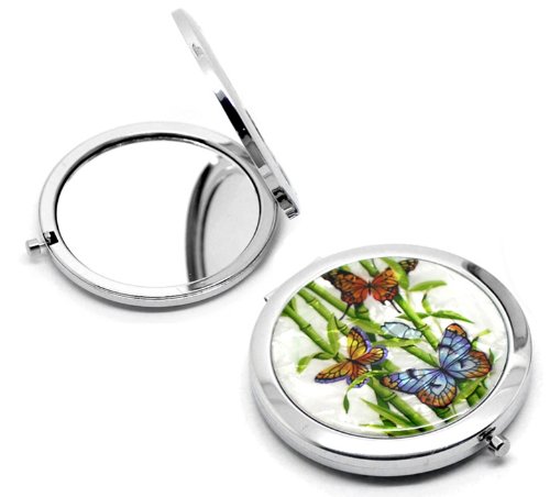 CKB Ltd ? 1 x TRIPLE Butterfly Mother of Pearl Effect Make Up Pocket Compact Mirror cosmetic Art Deco Bamboo Stick Leaf Pattern 7.7x7cm (3"x2-3/4"),