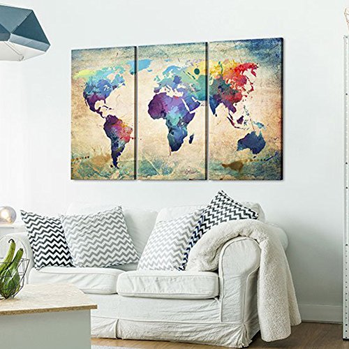 Triple mappa del mondo image- immagine stampata su tela - Stampa artistica da parete, decorazione da parete, globo mappa del mondo continenti terra geografia retro Wallposter murale decor-120 * 80 cm, BIue, 120 x 80 cm
