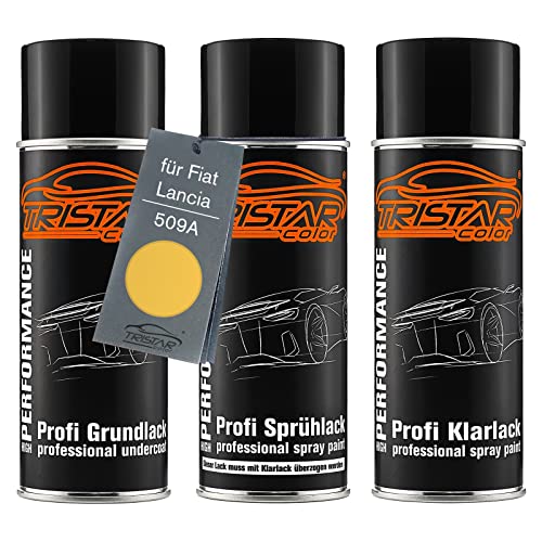 TRISTARcolor Vernice per auto Kit bombolette spray per Fiat/Lancia 509A Giallo Birichino/Tropicalia Gelb vernice di fondo, di base, trasparente