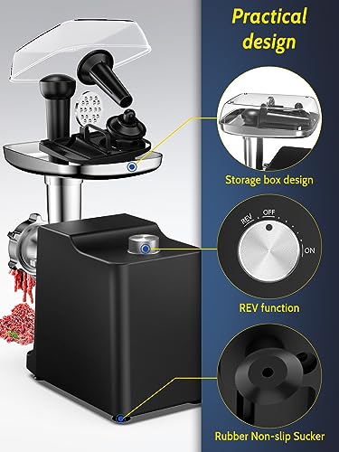 【Disegno Di Facile Utilizzo】Con 3 pulsanti (On/Off/Reverse). Se il cibo si è bloccato durante la macinazione, il pulsante "REV" può sbloccare facilmente l'unità. Dotato di protezione da surriscaldamento, evitare che il motore si bruci. La scatola di immagazzinaggio è adatta per organizzare gli accessori. La ventosa in gomma antiscivolo mantiene stabile il tritacarne elettrico durante la macinazione.
