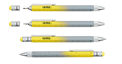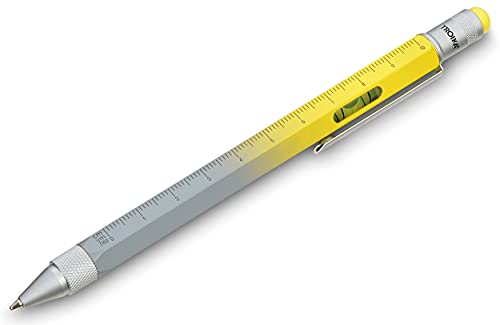 TROIKA Construction PIP20YE/GY - Penna a sfera multitasking, in ottone spazzolato, mina nera, con righello centimetro/pollice, scala 1:20/1:50, livella, cacciavite, colore: Giallo