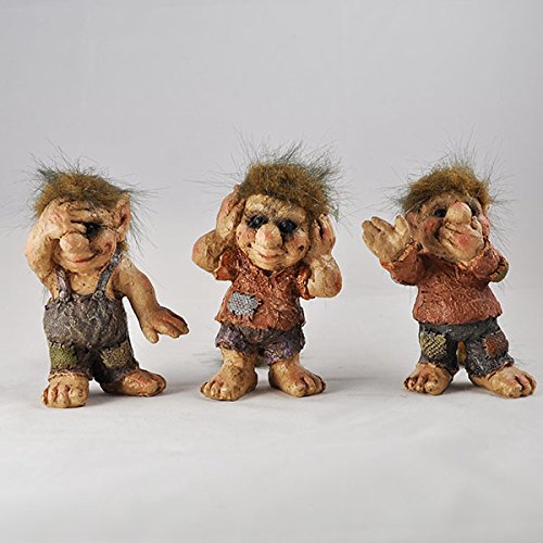 Tre Troll saggi, “non vedo il male, non parlo del male, non sento il male”, piccole sculture, altezza 10 cm
