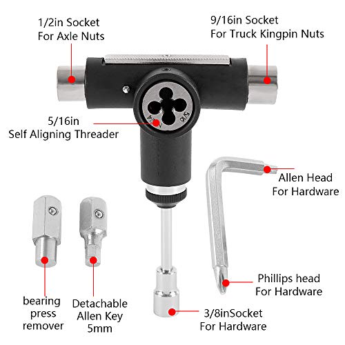 DESIGN ALL-IN-ONE: Lo strumento da skateboard include 3 diverse dimensioni di manicotti, un dispositivo di pressione / rimozione del cuscinetto, una chiave a brugola rimovibile, una chiave a brugola, un cacciavite Phillips, una lima di precisione e un asse filettato Funzione di cricchetto di infilatura