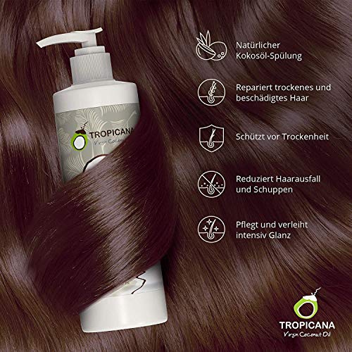 INGREDIENTI INTENSI IDRATANTI PER CAPELLI: Questo balsamo cocco bio di Tropicana Oil è realizzato con puro olio di cocco biologico pressato a freddo, estratto di aloe vera, estratto di ginseng e olio di argan capelli. Un trattamento naturale per capelli danneggiati e un'aggiunta alla cura quotidiana dei capelli. Una formula biologica professionale nutriente grazie a questo balsamo capelli ricci e lisci con olio di cocco naturale.