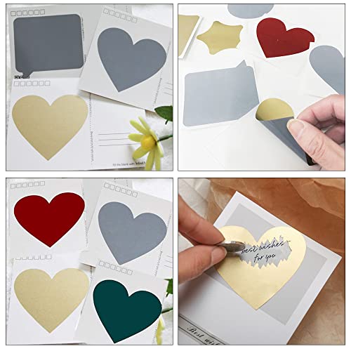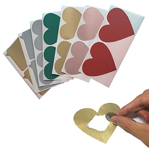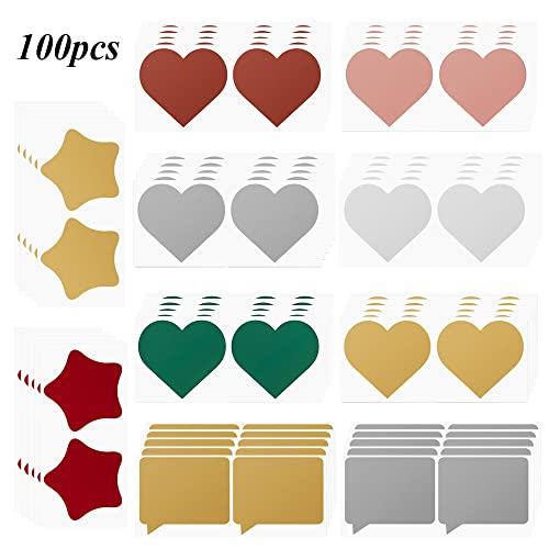 Confezione: 10 tipi di adesivi gratta e vinci - Finestra di dialogo Oro, Finestra di dialogo Argento, Stella rossa, Stella d'oro, Cuore verde, Cuore rosso, Cuore d'argento, Cuore d'oro, Cuore d'oro rosa, Cuore grigio argento, 10 pezzi per ogni stile.