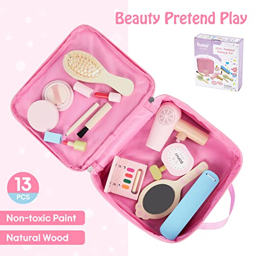 Kit di trucco in legno giocattolo, set per salone di bellezza per bambini, set da gioco per trucco da 12 pezzi, con asciugacapelli, specchio, profumo e borsa per la conservazione