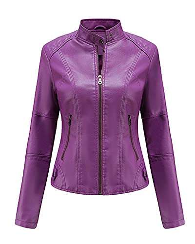 TrusMe Giacche in Pelle da Donna Slim Stand-Up Collar Zip Up Short Biker Giacche PU Viola Cappotto Blazer,Viola,XXL