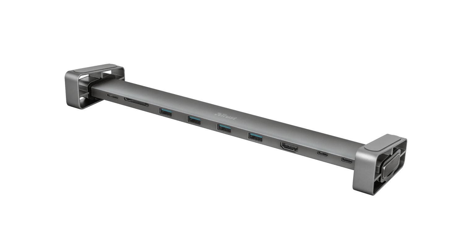 Per potenziare il flusso di lavoroCon la docking station multiporta USB-C 10-in-1 Trust Dalyx, è davvero possibile trarre il massimo dal laptop. Si può aumentare il numero di porte sul laptop e collegarsi con più dispositivi attraverso USB-C, HDMI, USB-A e una porta di rete, oltre a importare dati mediante un lettore di schede.Semplice configurazione e compatibilitLa versatile Trust Dalyx 10-in-1 funziona con ogni laptop, MacBook e tablet* dotati di porta USB-C. Dalyx 10-in-1 consente di trasferire dati in modo estremamente rapido su quattro porte USB-A, a velocità fino a 5 Gbps via USB 3.2 Gen 1. Non occorre installare alcun software per questo comodo strumento, è sufficiente inserire la spina & partire! *La compatibilità con i tablet Android può variare in base all'implementazione USB-CAmpia connettivitCon un'unica porta USB-C sul dispositivo, Dalyx 10-in-1 offre una connettività versatile. Collegando il tablet o il laptop a un monitor o alla TV tramite la porta HDMI, è possibile vedere film e foto in Ultra HD 4K. Per collegarsi con una rete cablata tramite la porta Ethernet Gigabit, ottenendo una connessione stabile e ultraveloce. È possibile importare foto tramite il lettore di schede, ricaricare il laptop sul lato con la porta USB-C con tecnologia PD (Power Delivery) e aggiungere altri dispositivi come la tastiera e un drive esterno tramite le porte USB-A.