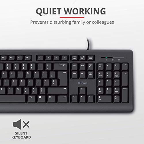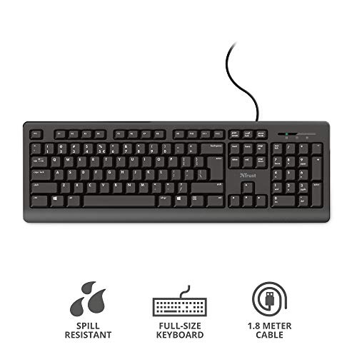 Trust Tastiera cablata Taro 24095, Qwerty UK Layout, tasti silenziosi, tastiera full-size, resistente agli urti, cavo 1,8 m, spina USB e play, tastiera per PC, laptop, Mac, colore: nero