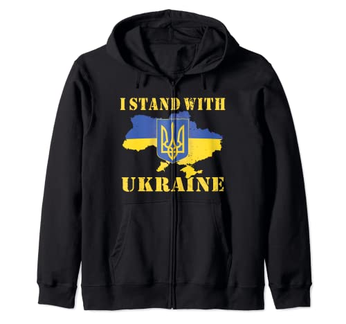 Bandiera ucraina dal design alla moda vintage, colori patriottici, angosciata, per lui e per lei. Ucraina, mappa paese, forma, "I Stand With Ukraine", testo