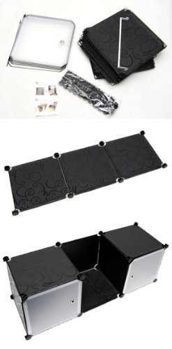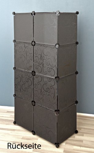 Polipropilene di alta qualità in colore nero, aste in metallo nero laccato. Dimensioni: 76x148x38 cm. 8 cubi con sportelli, ciascuno 36x36 x36 cm. Barra appendiabiti in metallo bianco lunga 35 cm.
