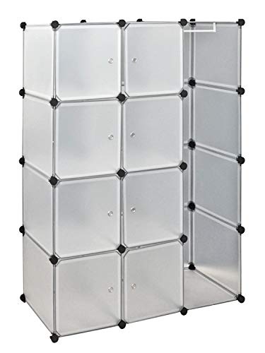 Polipropilene di alta qualità in bianco trasparente, aste in metallo nero laccato.Dimensioni:114x148x38 cm.8 cubi con sportelli, ciascuno 36x36x36 cm. Barra appendiabiti in metallo bianco lunga 35 cm.