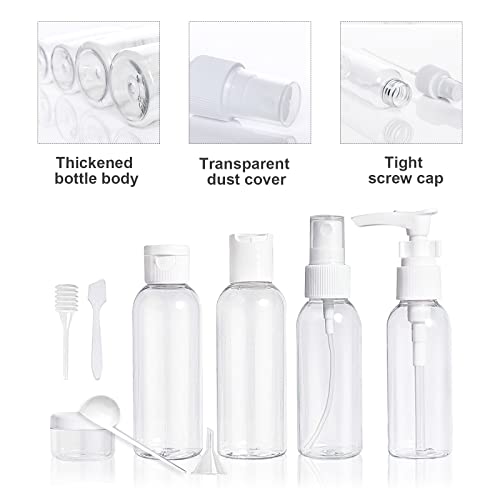 RICEVERAI: il kit di flaconi da viaggio include 2 flaconi con tappo a scatto da 80 ml, 2 flaconi con pompa da 80 ml, 2 flaconi spray da 50 ml, 2 flaconi con tappo a vite da 50 ml, 4 vasetti di crema da 10 g, 2 cucchiai dosatori da 10 ml, 2 pezzi Pipetta, imbuto da 2 pezzi, spatola da 2 pezzi, il nostro kit di articoli da toeletta da viaggio è perfetto per i tuoi viaggi in crociera, viaggi di lavoro, ecc.